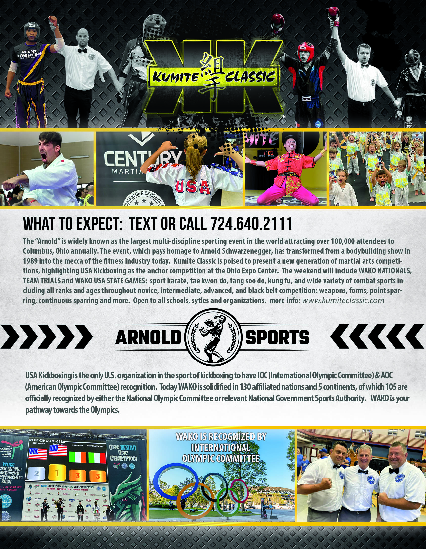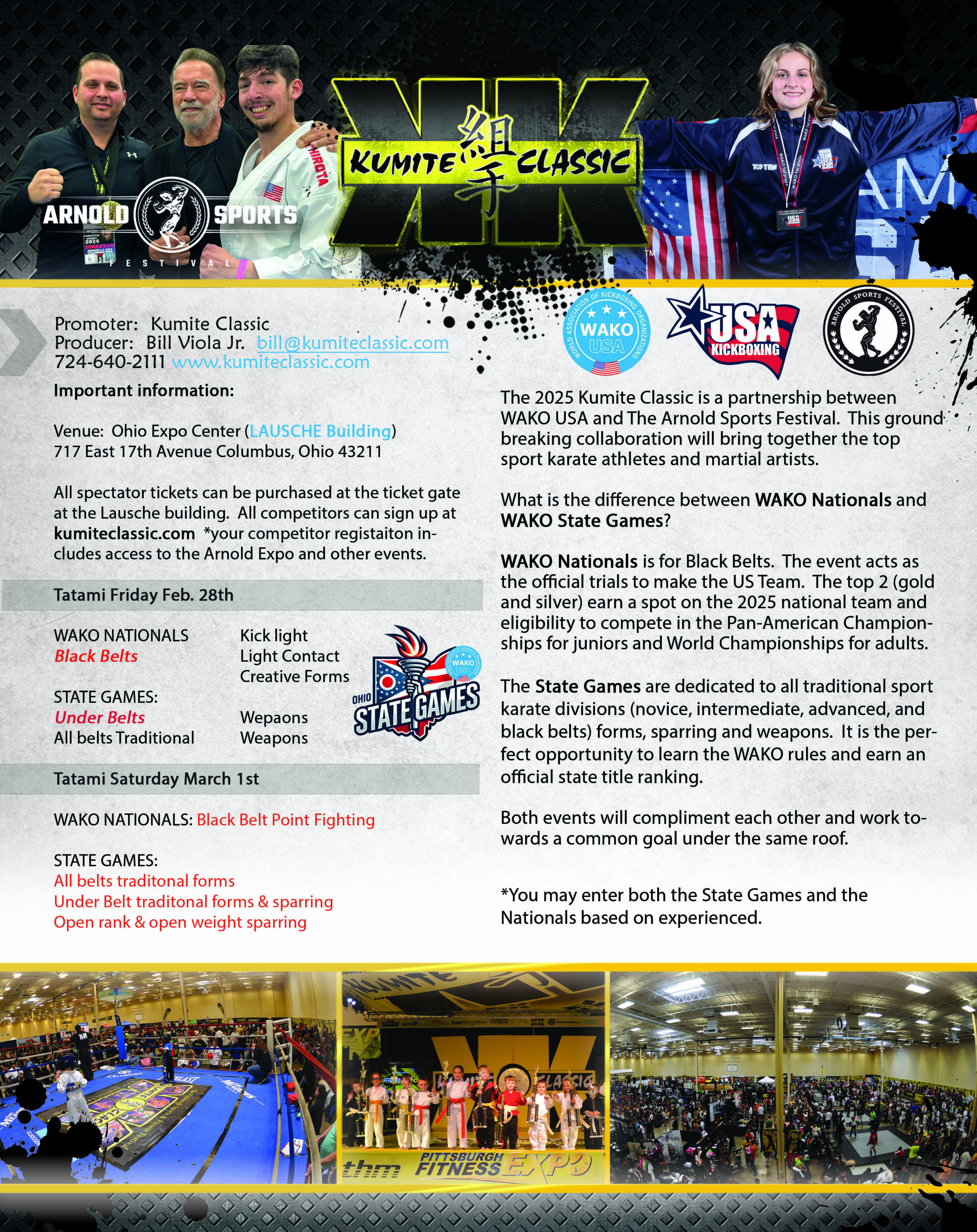 - The Arnold Sports Festival is held annually in Columbus, Ohio, usually in March, and attracts over 200,000 attendees. The festival hosts over 80 events across various sports, from traditional competitions to newer additions like eSports. It is one of the largest fitness and multi-sport events globally, and the Arnold Classic remains one of the most prestigious bodybuilding competitions in the world. The Arnold Sports Festival has become not just an event but a celebration of fitness culture, health, and athleticism, offering a platform for athletes, fans, and brands to come together in a shared passion for fitness. In 2025 Bill Viola Jr. will bring the Kumite Classic brand to the Arnold Sports Festival and host the WAKO National championships.